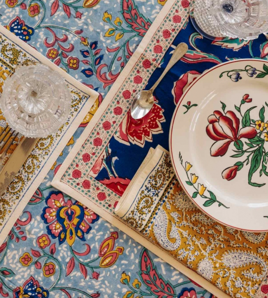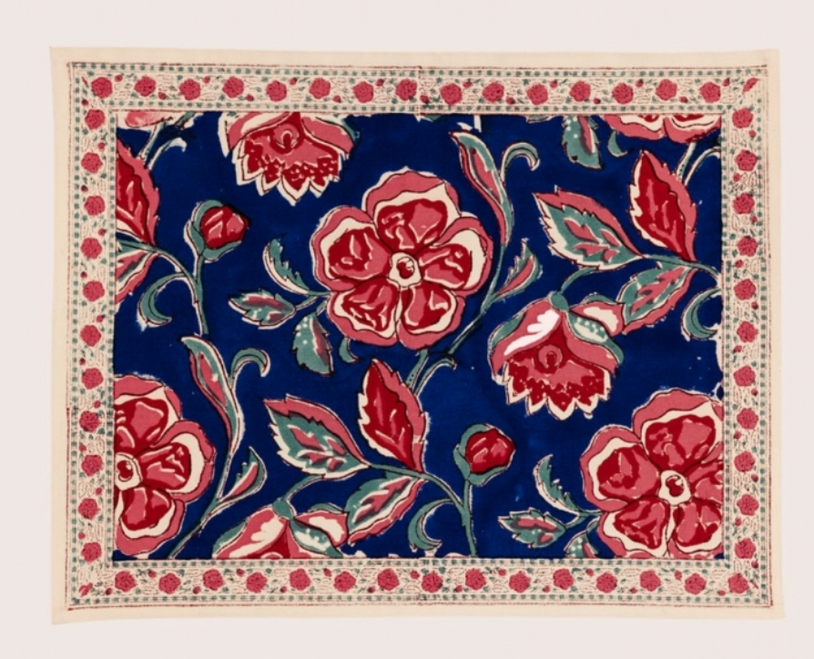 Ce set de table en coton a été imaginé à Paris puis imprimé à la main par des artisans experts en Inde dans le plus grand respect des traditions indiennes. Le blockprint ou impression au tampon de bois est un savoir-faire typique du Rajasthan dans l’Ouest de l’Inde. Cela consiste à imprimer manuellement le tissu grâce à des tampons de bois sculptés à la main, ce qui donne au tissu un caractère unique par son toucher et ses irrégularités.
