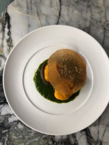 Cinquième étage : Dressage : Verser une cuillère de chlorophylle de cresson au fond d’une assiette, puis le champignon au centre, garnit de purée de carotte. Pour finir déposer délicatement un disque de feuille de brick.
